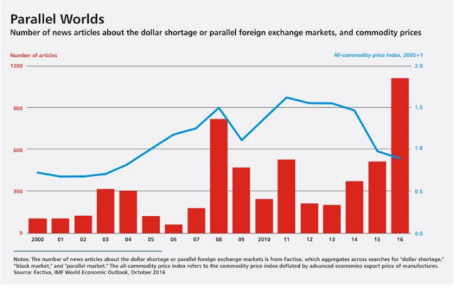 A search of news articles from 2000 to 2016 in which the terms “dollar shortage,” “black market,” or “parallel markets” for foreign exchange appeared (shown in the chart, along with an all-commodity price index), indicates that dollar shortage concerns escalated in 2008, amid the global financial crisis. The increase since 2014, however, has been more persistent.