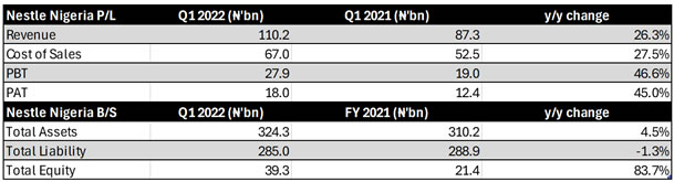 Nestlé Nigeria, one of the largest players in the FMCG space, enters 2022 with strong brand equity in food and beverages but also high exposure to imported raw materials, particularly milk derivatives and grains. The company reports 26.3% revenue growth in Q1 2022, yet the cost of sales rose by a higher margin (up 27.5%). The company faces a difficult equation: keep retail prices stable to preserve market share or raise them and risk volume decline.