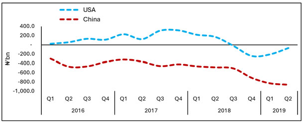 Chart 2: Nigeria’s goods trade balance with the US and China