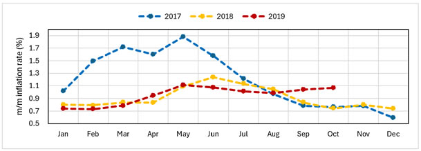 An analysis of National Bureau of Statistics (NBS) data reveals that, throughout the escalation of global trade tensions in the first half of 2019, it had barely any effect on headline inflation. For instance, annual headline inflation trended lower from 11.37% in January to a year-low of 11.02% by August. In contrast, monthly (m/m) pressures rose steadily till a H1:2019 peak of 1.1 in May – the same period US and China reignited the trade feud. A further analysis of the monthly inflation trend over H1 with previous years suggests that the inflation pattern is not unusual. In fact, it is not until September that there is a noticeable breakoff with the historical pattern so far this year. Unlike in 2017 and 2018, when monthly inflation was decelerating, September’s rate printed at 1.04%, up from 0.99% in August. This inflection point points to the land border closure policy rather than the US and China.